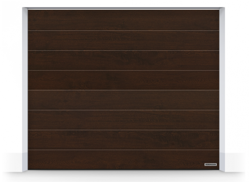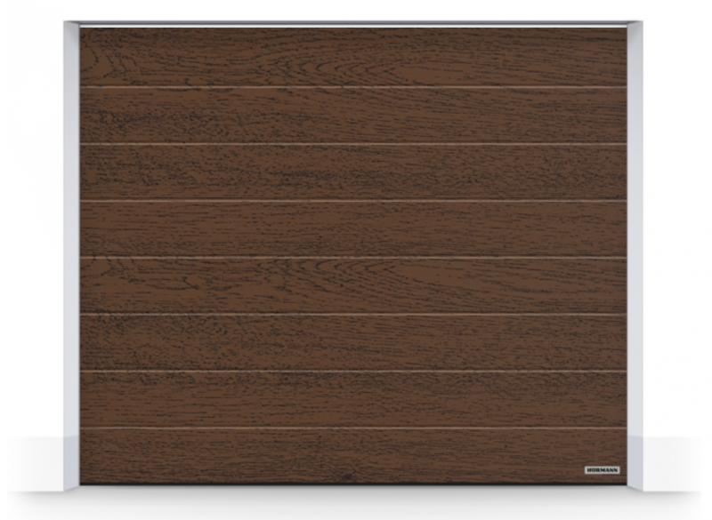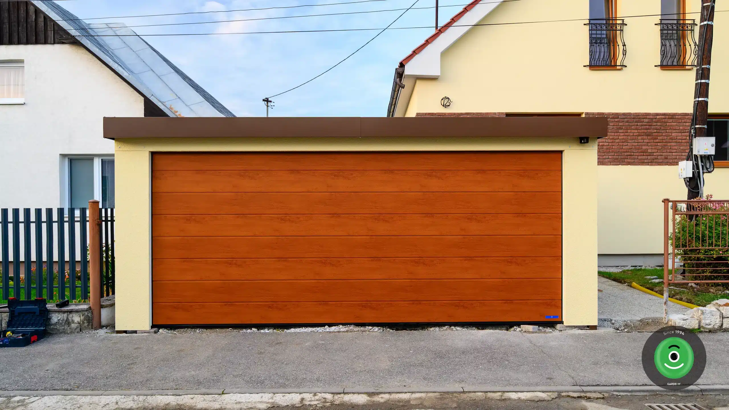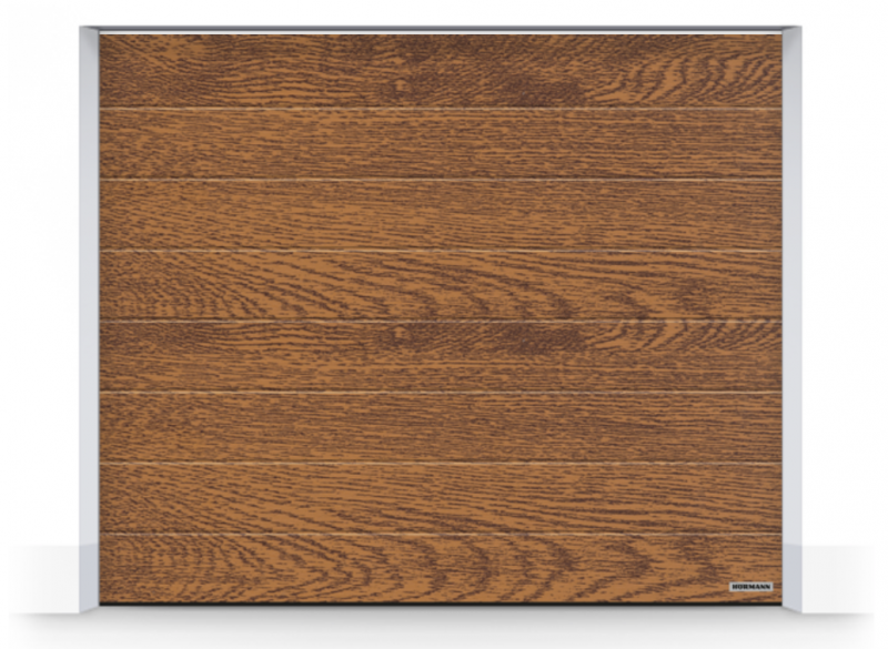 A szekcionált garázskapu egyik fő előnye a kiváló hőszigetelést biztosító, dupla falú, szigetelt lamellák sora. A modern megjelenést nyolc Woodgrain felületű lamella adja, elegáns M‑profilos díszítéssel.