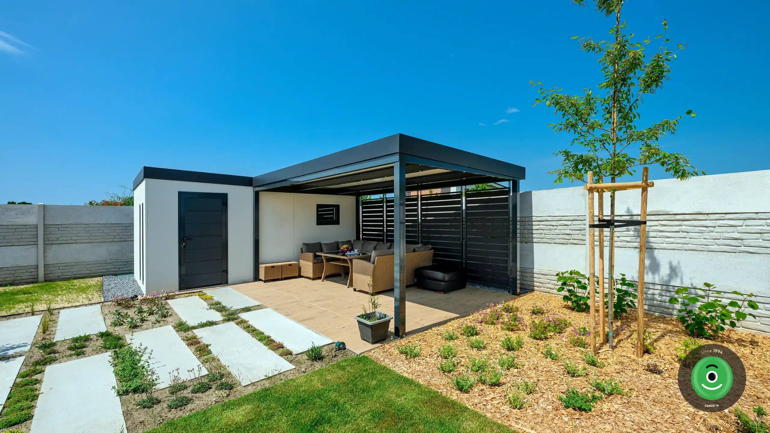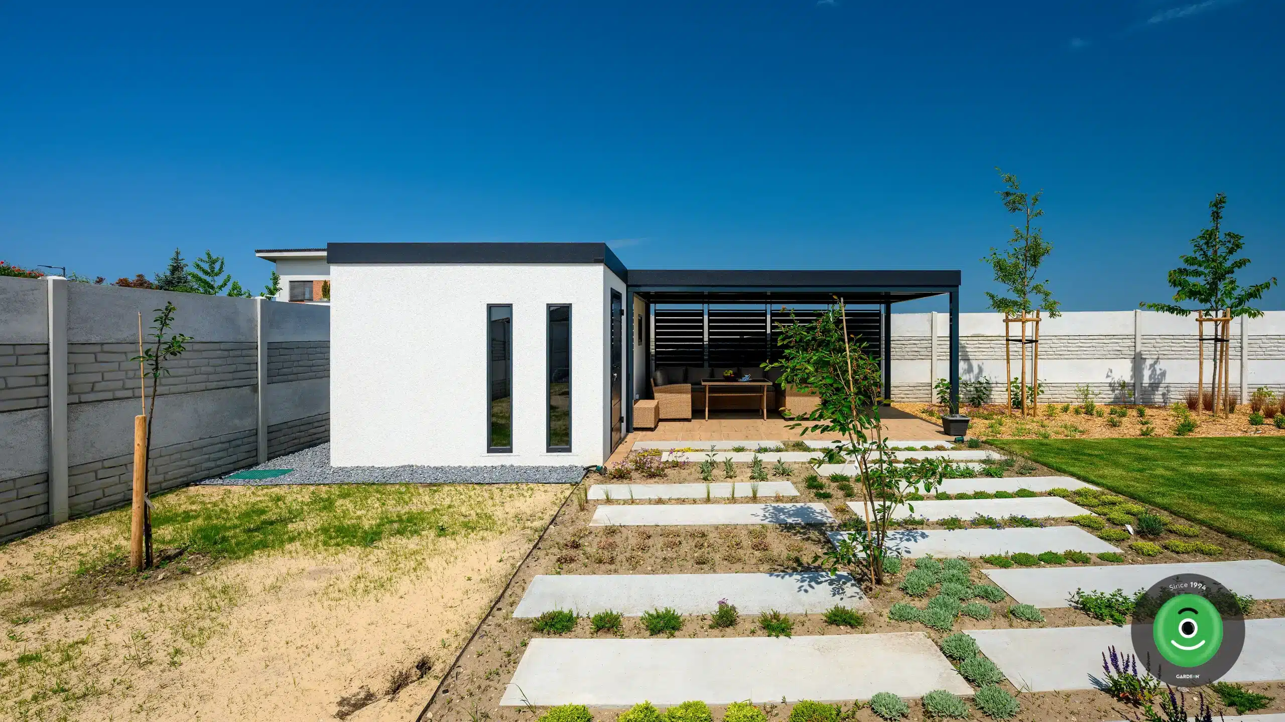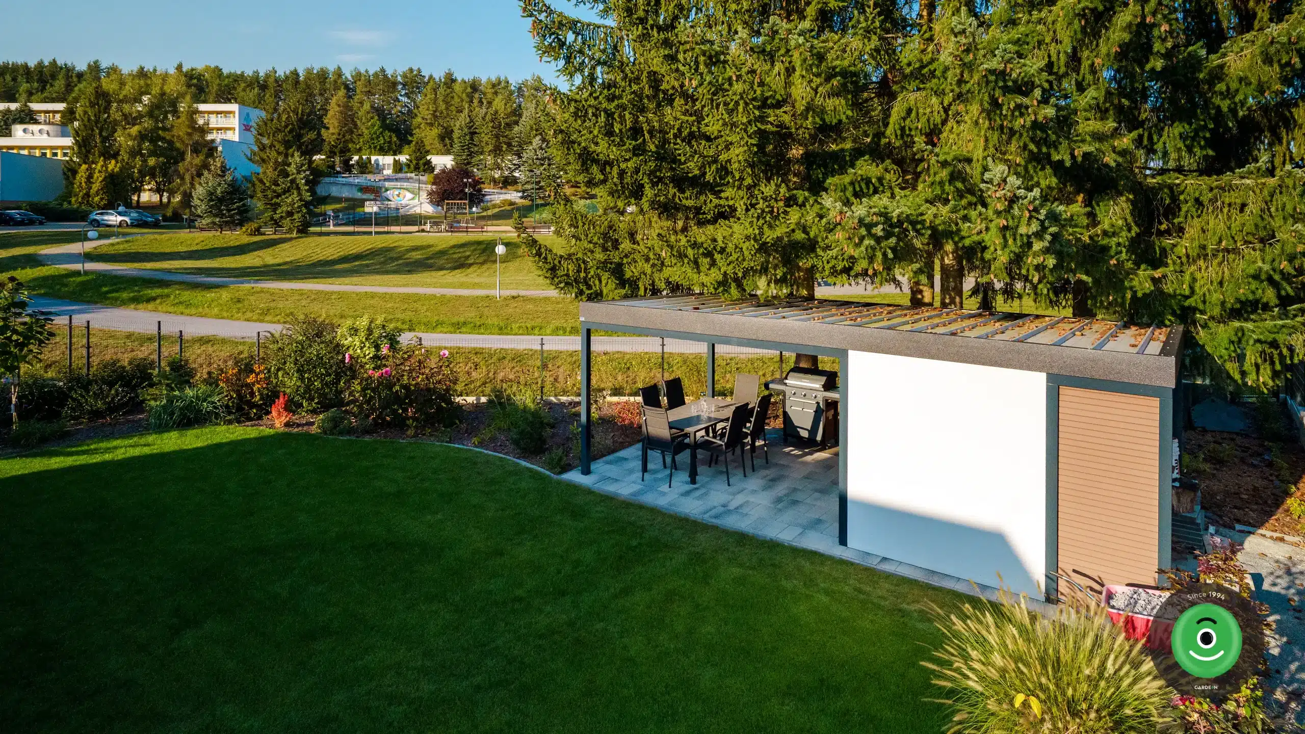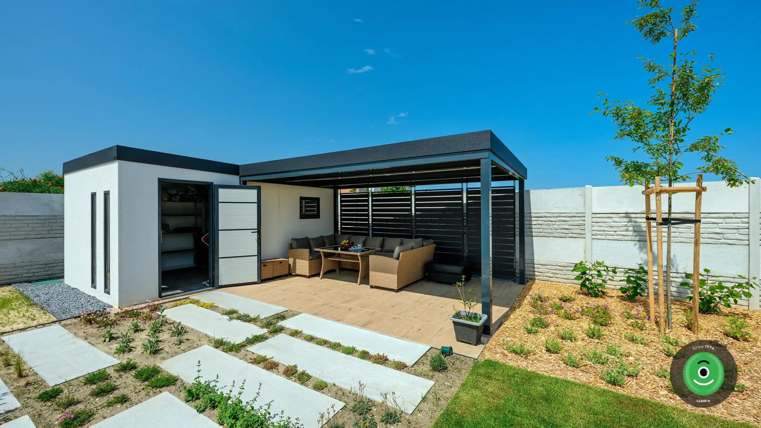 Ez a praktikus „kettő az egyben” megoldás ideális nyári konyhaként is funkcionálhat: a zárt részben kap helyet a munka- és tárolófelület, míg a tetővel védett, nyitott rész romantikus kerti étkezéshez vagy grillezéshez nyújt tökéletes helyszínt.