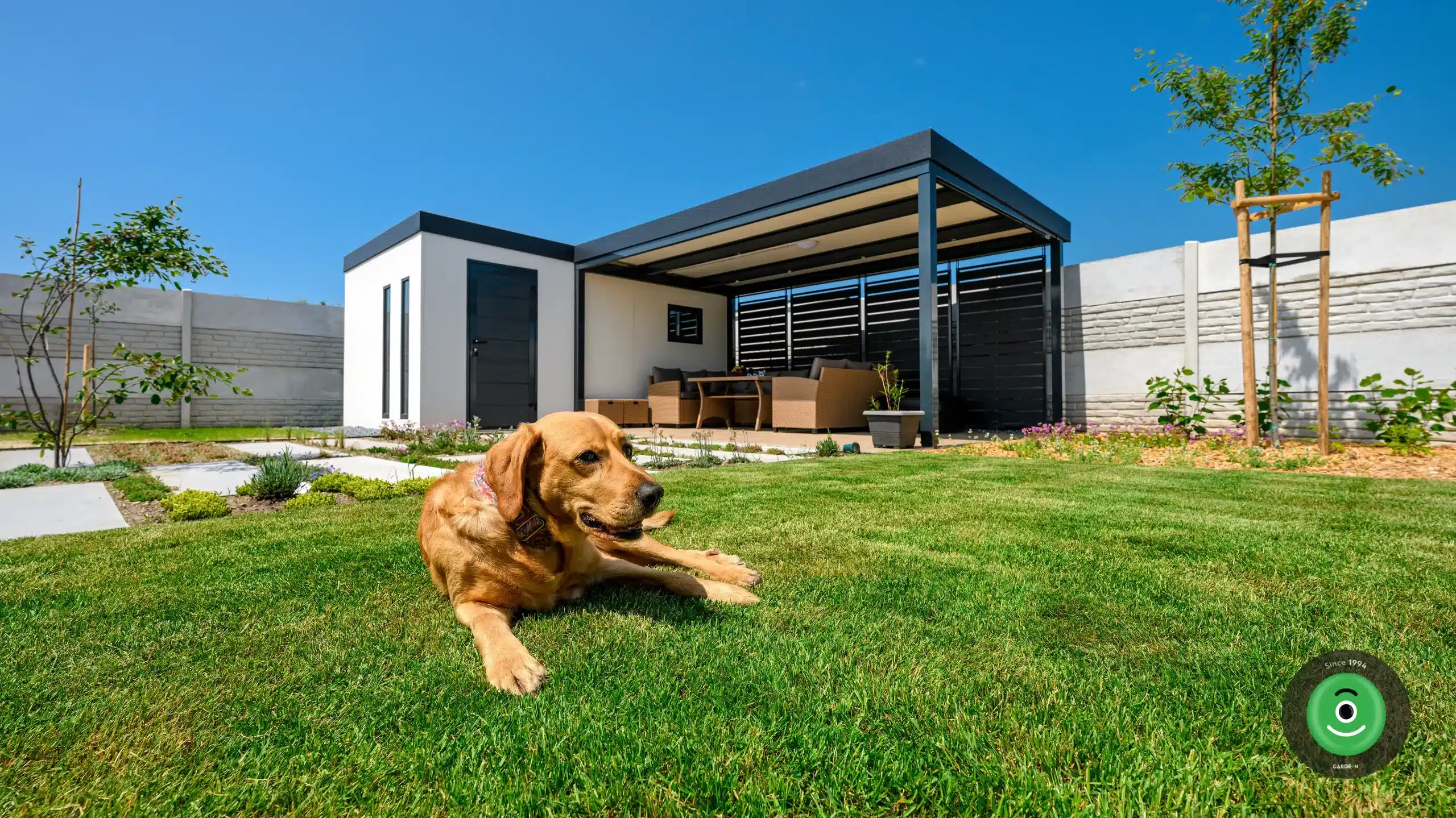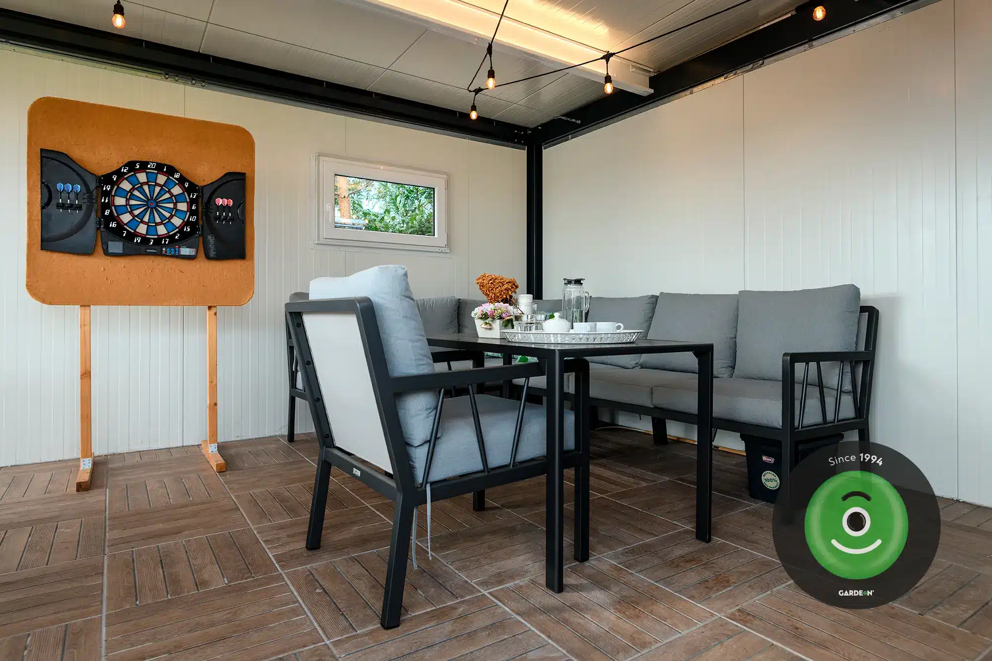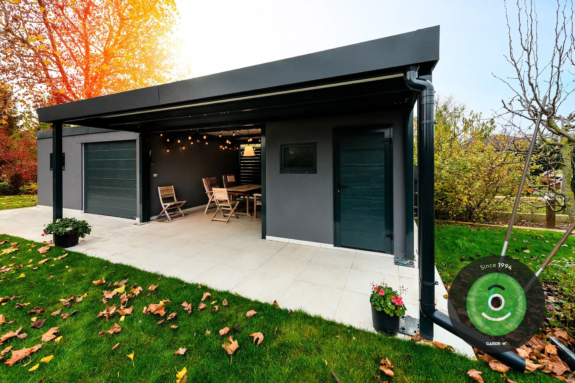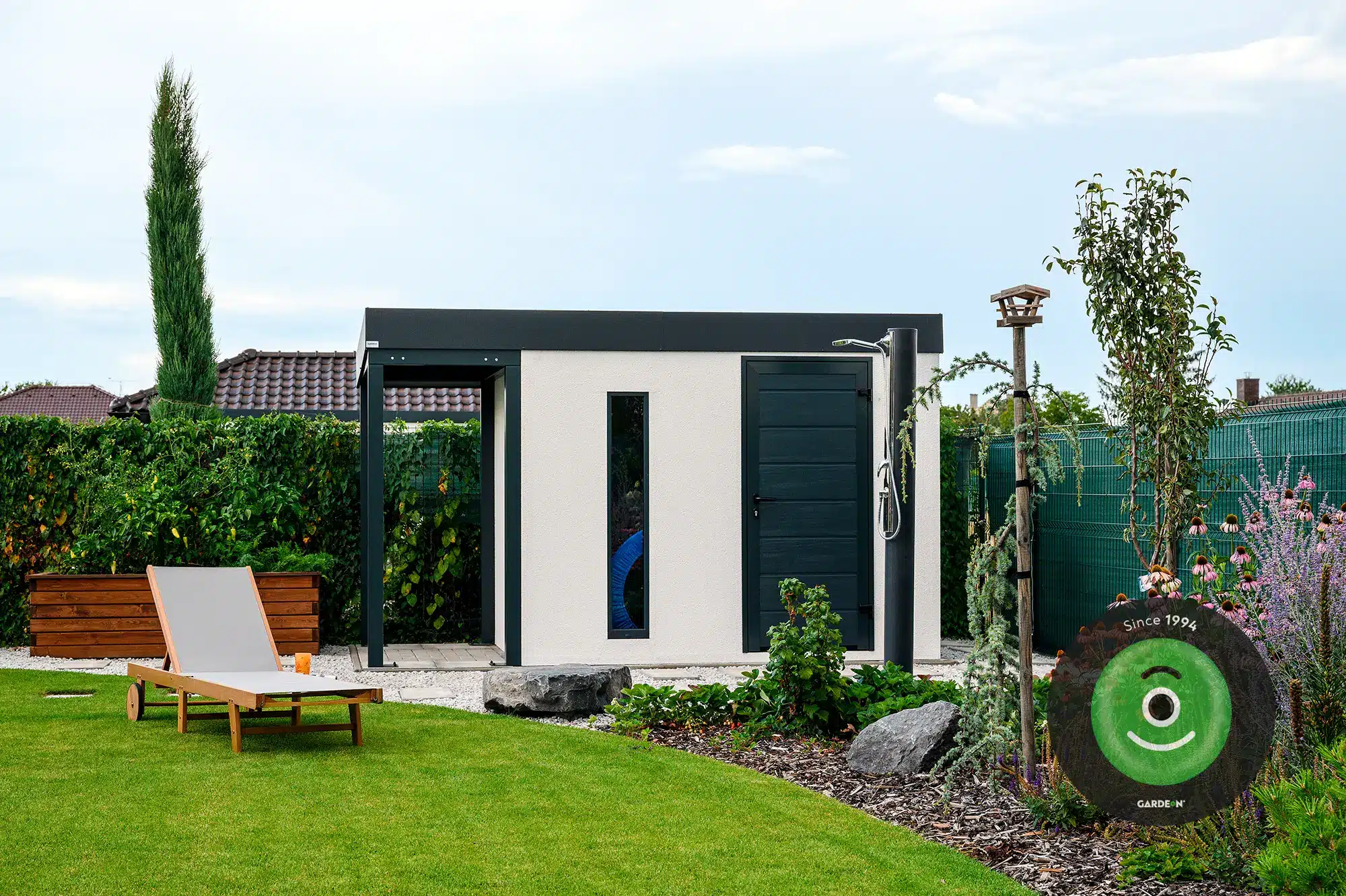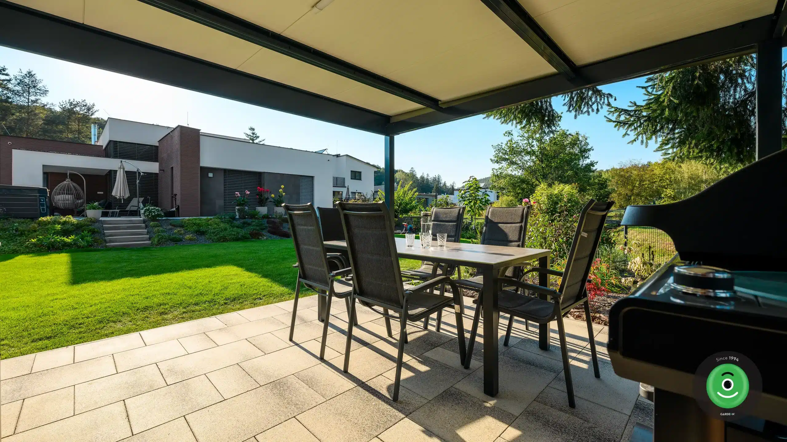 Ez a praktikus „kettő az egyben” megoldás ideális nyári konyhaként is funkcionálhat: a zárt részben kap helyet a munka- és tárolófelület, míg a tetővel védett, nyitott rész romantikus kerti étkezéshez vagy grillezéshez nyújt tökéletes helyszínt.