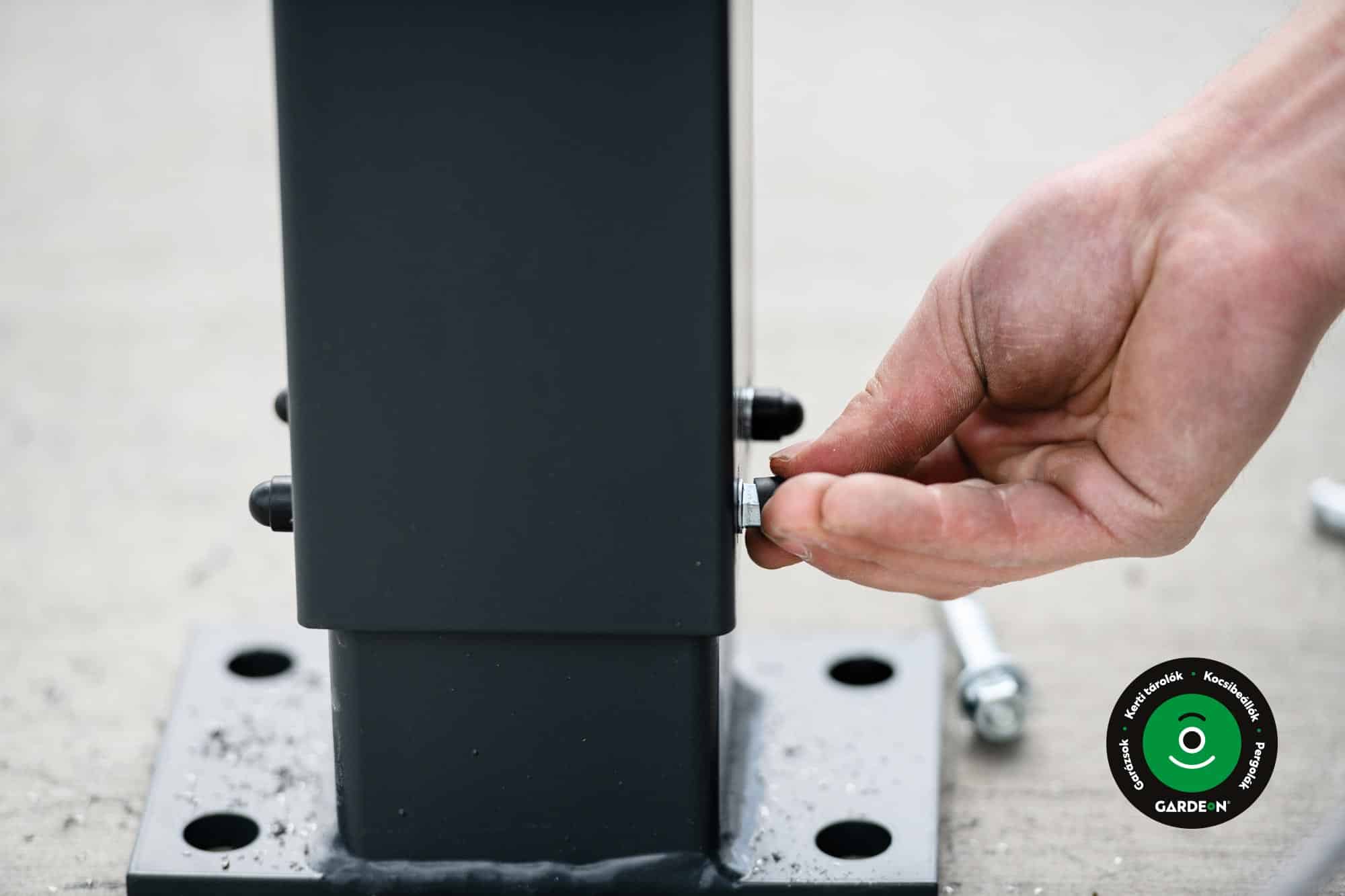 A betonpillérekre először horganyzott acélból készült talplemezeket (ún. „papucsokat”) erősítünk.