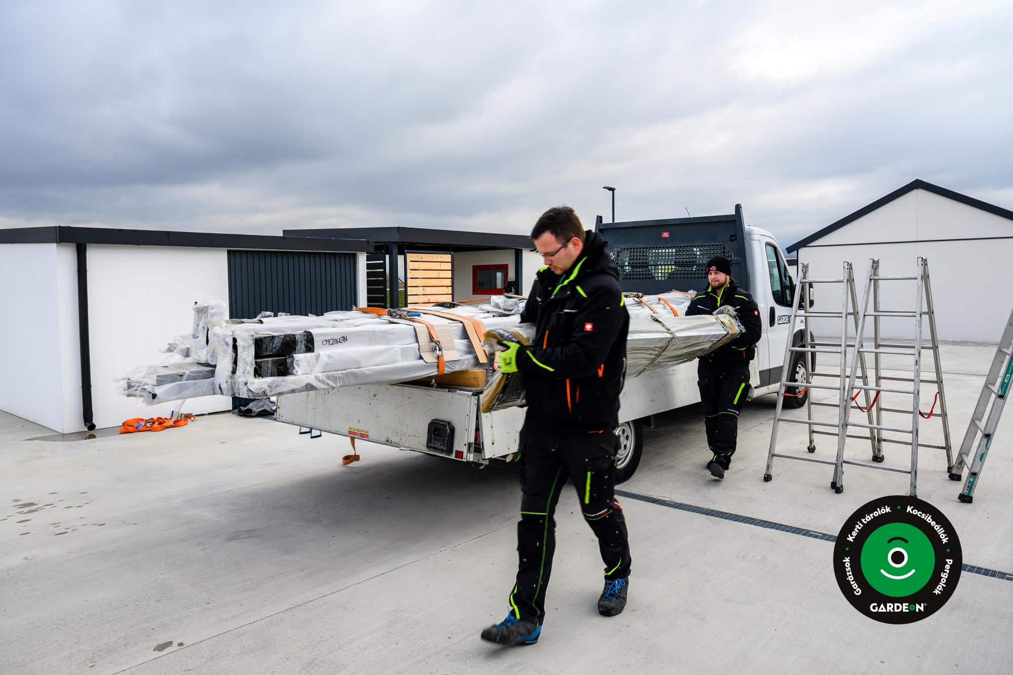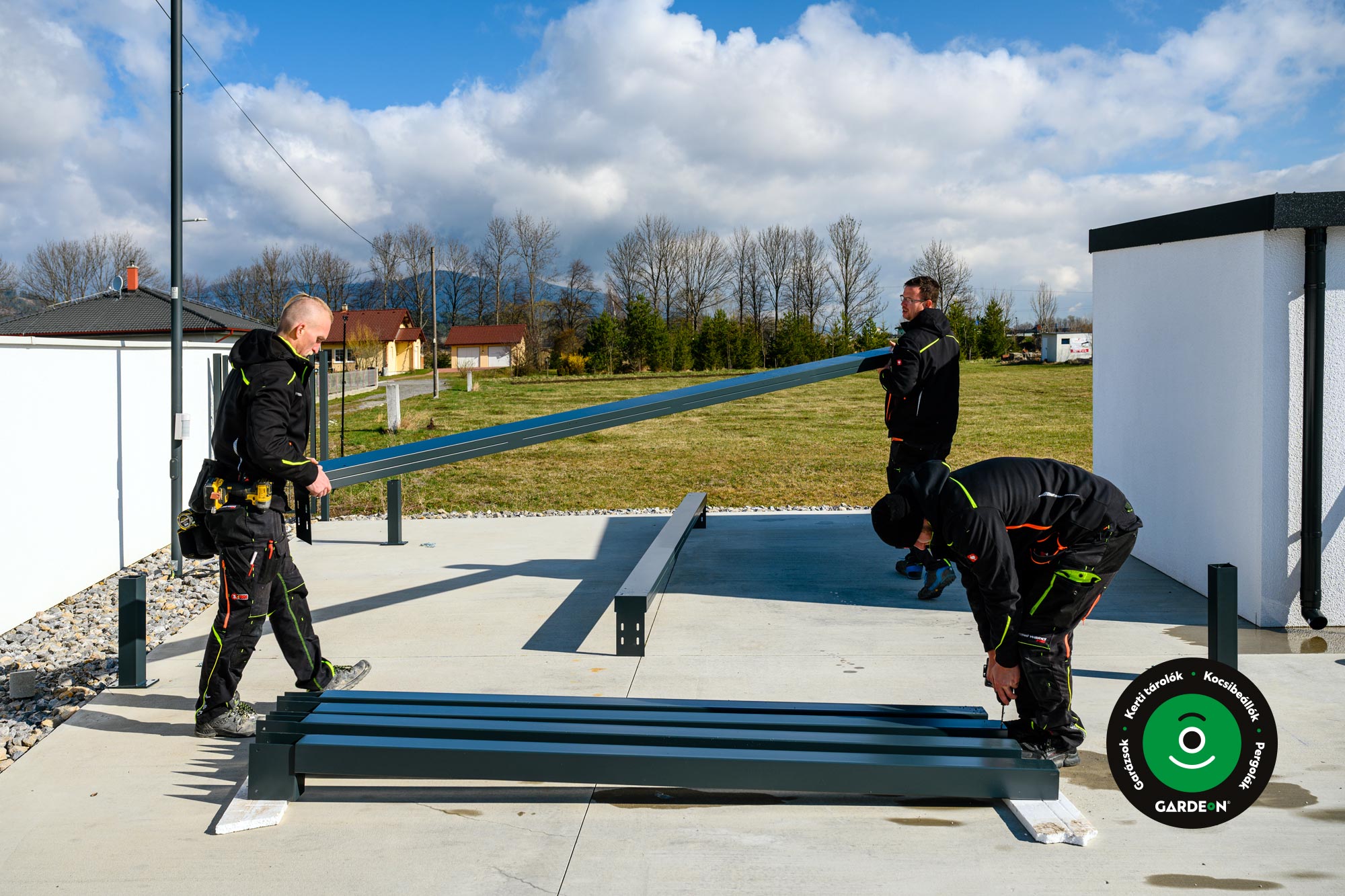 A részekre bontott pergolát 3,5 tonnás kis teherautóval visszük el Önhöz, így szinte bárhová eljuthatunk. A telepítéshez nincs szükség nehézgépekre, ezért ne aggódjon akkor sem, ha a telek nehezen megközelíthető. Az elemek lerakodásához és összeszereléséhez elegendő képzett munkatársaink csapata. A szerkezet méretétől és a kiegészítőktől függően 3–6 óra alatt készen is vannak.