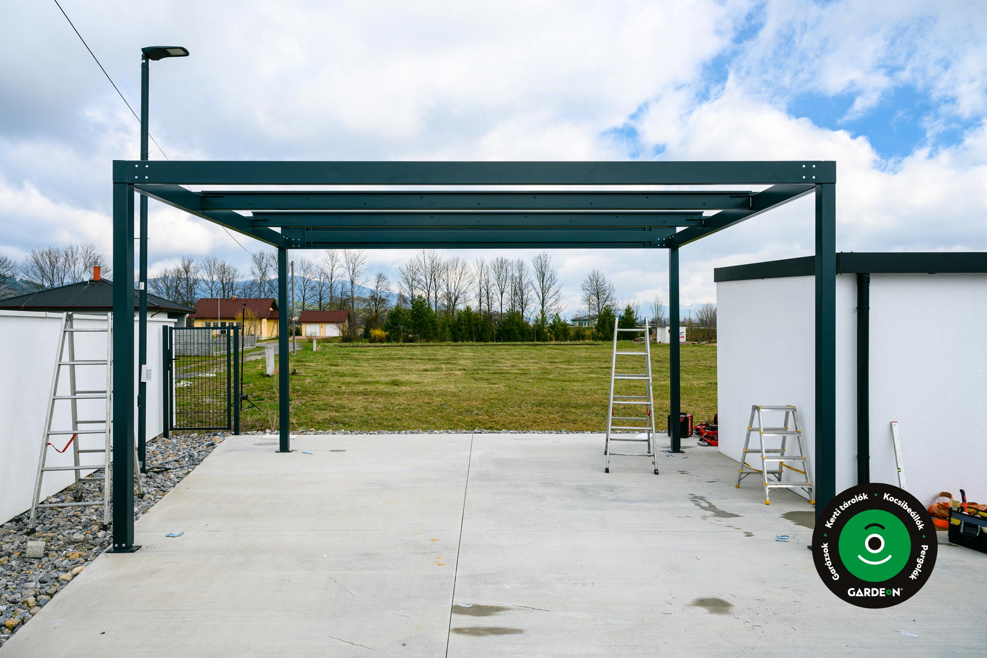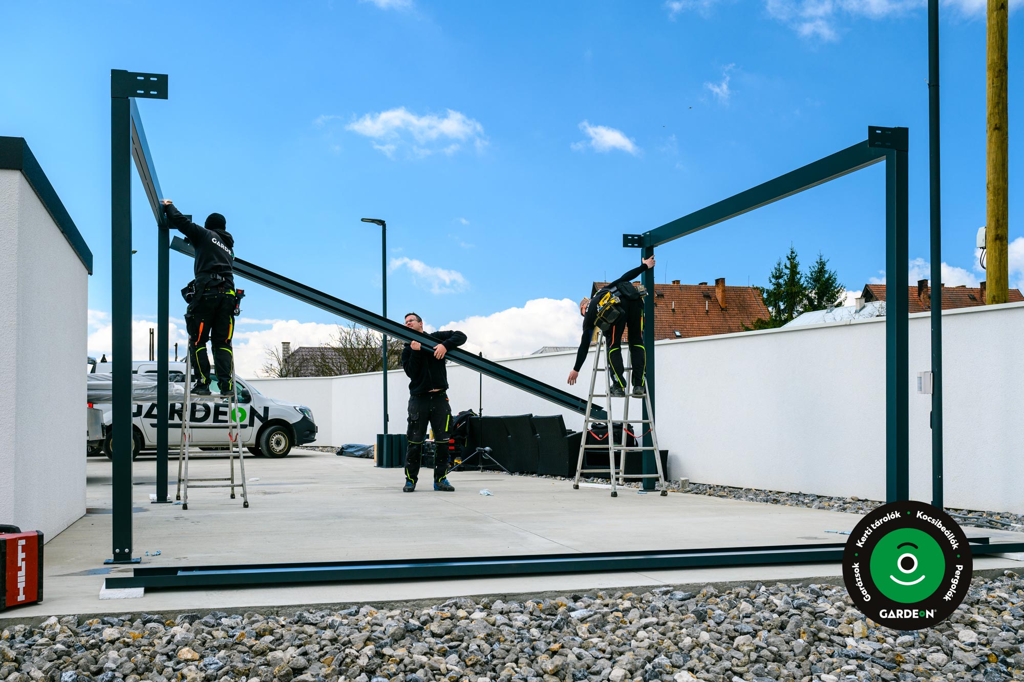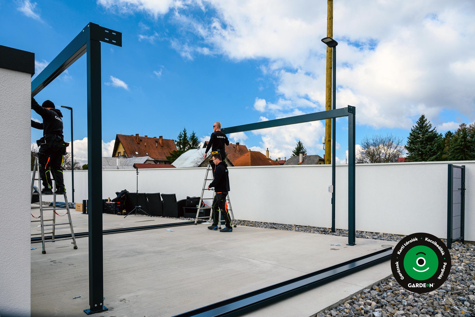 A pillérekbe ezután oszlopokat építenek be, amelyek a tetőgerendákkal együtt a pergola alapvető tartószerkezetét alkotják. Ezt követi a tetőfedés beépítése és a lapostető attikával történő lezárása.