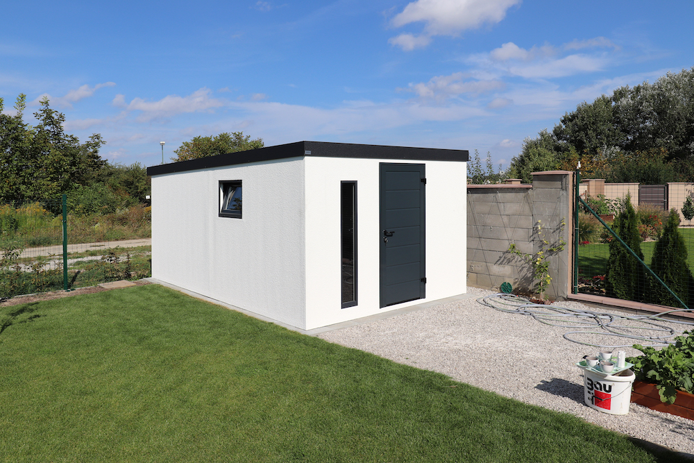 A kész vakolattal ellátott kerti ház egyszerű és természetes hatást kelt, így harmonikusan illeszkedik a legkülönbözőbb környezetbe.
