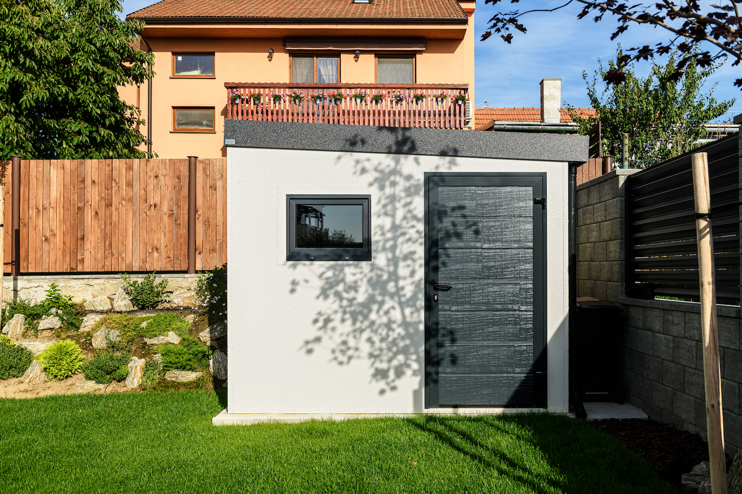 A kész vakolattal ellátott kerti ház egyszerű és természetes hatást kelt, így harmonikusan illeszkedik a legkülönbözőbb környezetbe.