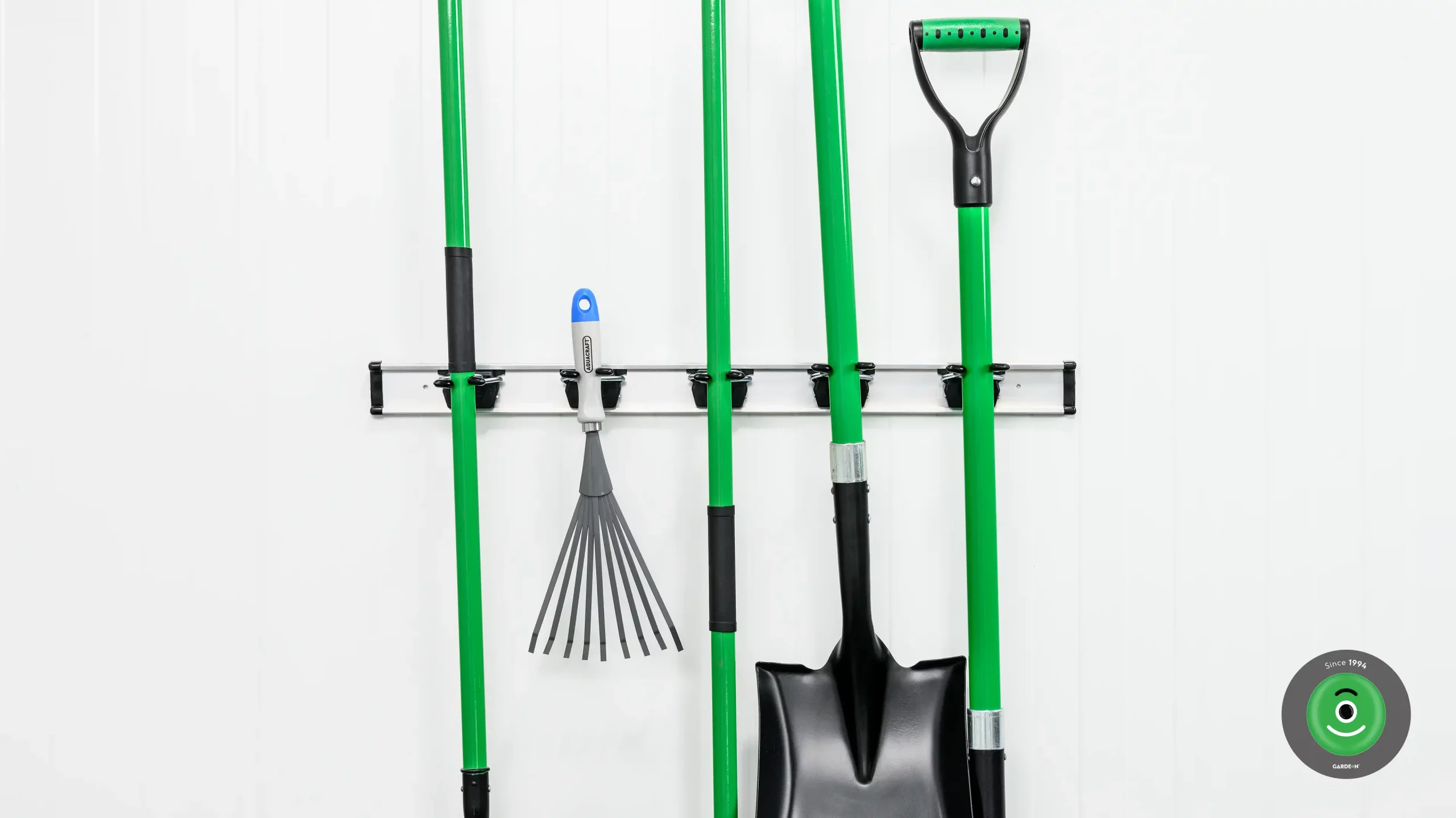 Így minden szükséges eszköz – a gereblyéktől és ásóktól kezdve a fűrészekig és baltákig – rendezett és áttekinthető módon, kéznél lesz.